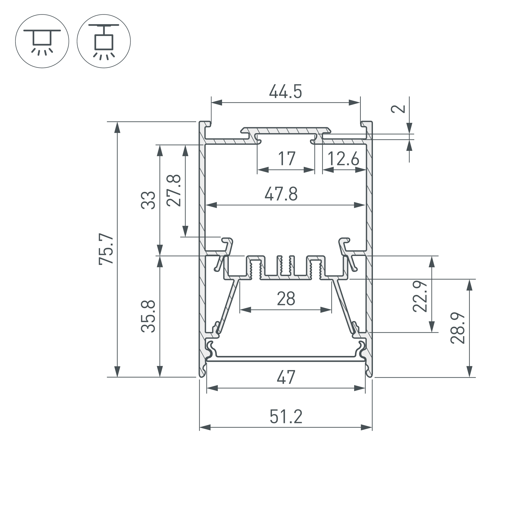 Подвесной/накладной профиль черного цвета из алюминия для основного освещения и контурной подсветки. Возможность установки антибликовой решетки Honeycomb поверх экрана позволяет получить более комфортное для глаз освещение. Отсек для блока питания (47,8х27,8 мм) и съемная площадка для светодиодной ленты значительно облегчают сервисное обслуживание осветительного оборудования. Габаритные размеры профиля составляют 2000 мм в длину, 51,2 мм в ширину и 75,7 мм в высоту. Площадки для установки светодиодных лент позволяют использовать ленты шириной до 28 мм и мощностью до 46 Вт/м. Это обеспечивает гибкость в выборе светодиодных лент и создает потрясающие световые решения. Экраны, заглушки и другие аксессуары не включены в комплект и приобретаются отдельно. Цена указана за 1 метр профиля. Отличное решение для создания современных световых проектов.